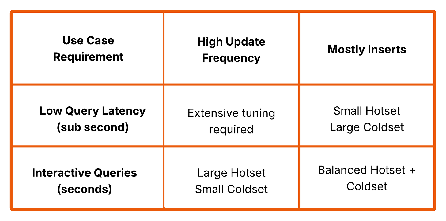 In practice, this is a favourable trade. The additional compute is limited to the hot data window, while the system avoids the much larger ongoing costs of constant writes, compaction, and maintenance in Iceberg. Rather than paying continuously for freshness, you pay only when you query, and only over a small slice of data.