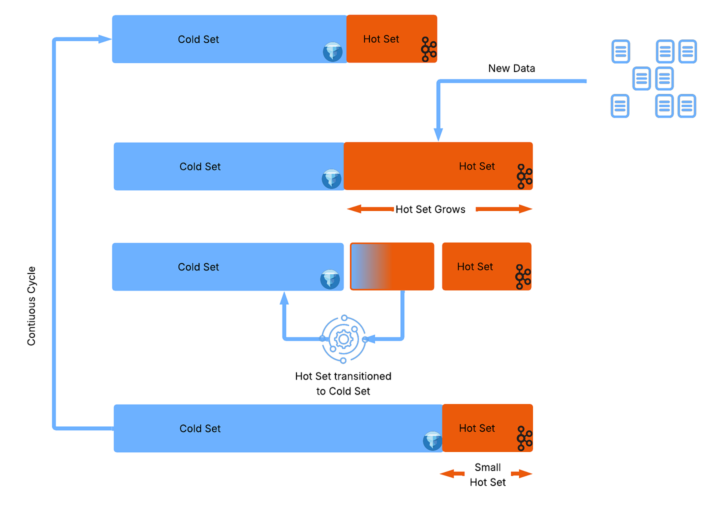 Streambased’s approach starts by embracing a distinction between log based event stream and materialised tables instead of fighting it. Rather than insisting that all data must be materialised into Iceberg before it can be queried, the dataset is split into two complementary parts. One part (the “coldset”) is fully materialised and lives in Iceberg, representing the stable, finalised, historical view of the data. The other part (the “hotset”) remains in Kafka as an ephemeral stream of recent changes. Queries operate across both, combining the durable cold data with the live hot data to produce a complete and up-to-date view. The sections are composable with the size of the two sections balanced according to the workload they serve. An easy to explain (but very naive) composition may expand the hotset (say last 6 hrs) for workloads that expect many updates and deletes to avoid accruing metadata in Iceberg but may have a much smaller hotset (say last 15 mins) for workloads that are primarily insert of new rows (a much less expensive operation in well partitioned Iceberg).