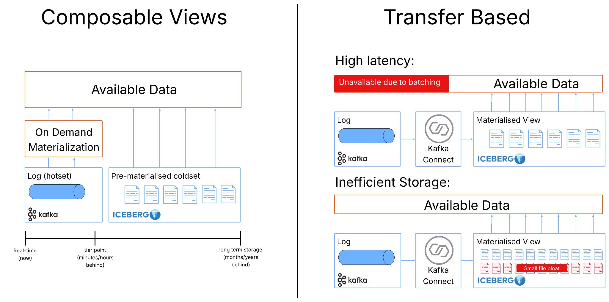 This shift has a subtle but powerful effect. By allowing recent data to remain in Kafka, the system avoids the constant pressure to translate every small change into file-level operations. In this sense, materialisation becomes a controlled, deliberate step rather than a continuous background process. Operators are free to make informed decisions about how and when materialisation happens and can accept the right tradeoffs for their use cases.