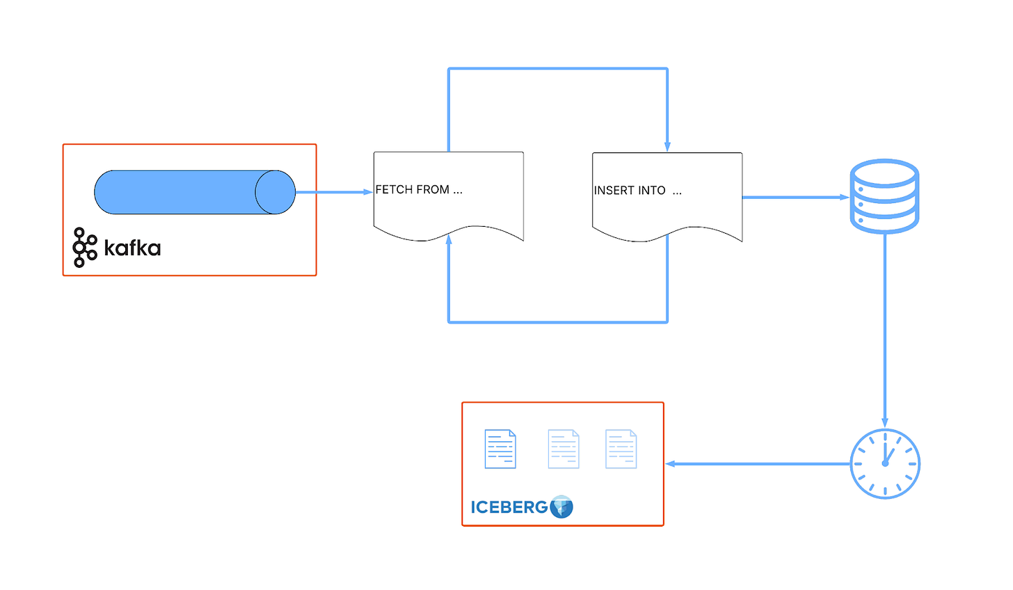 Kafka likes to pass messages around in small batches (~16KB). Conversely, Apache Iceberg works best when data is written in large chunks (~512MB). This mismatch is usually addressed by adding a step in the transfer flow that accumulates a number of small messages (usually driven by a total size in bytes or a time period) into a larger chunk before writing to Iceberg.