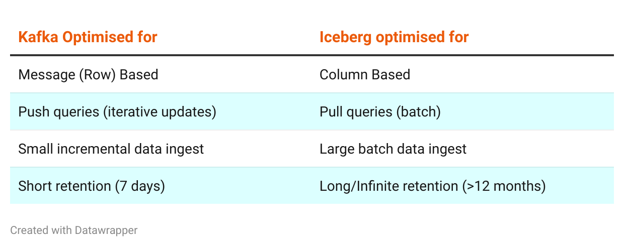 If you were to intentionally design two protocols/formats with poor interopability, you would be hard pushed to create something worse than Kafka protocol and Apache Iceberg. Both standards were developed and optimised for entirely different purposes and share almost nothing in common: