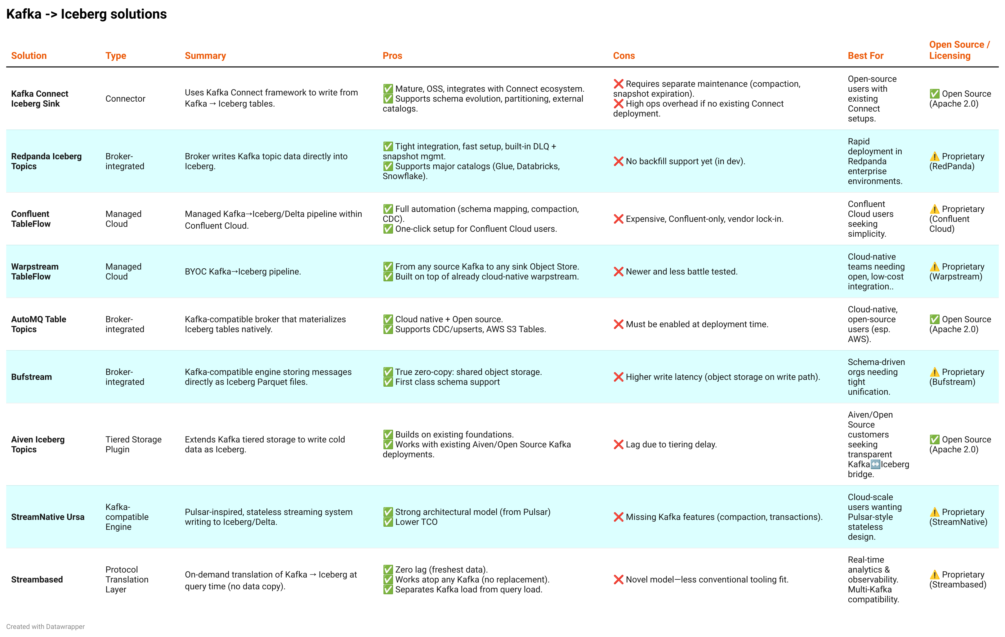 Confluent Tableflow → Enterprise-friendly but cloud only and vendor locked.
