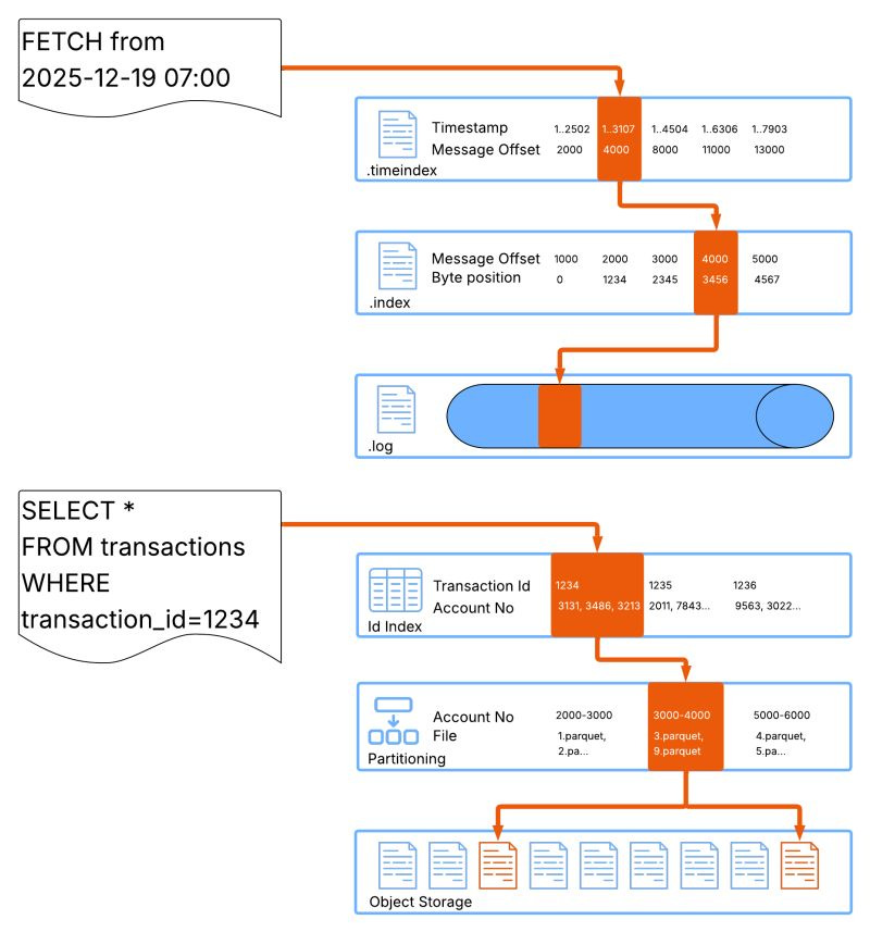 The principle is the same, Kafka translates timestamps → offsets → bytes; Iceberg translates predicates → partitions → files, both without changing the layout.