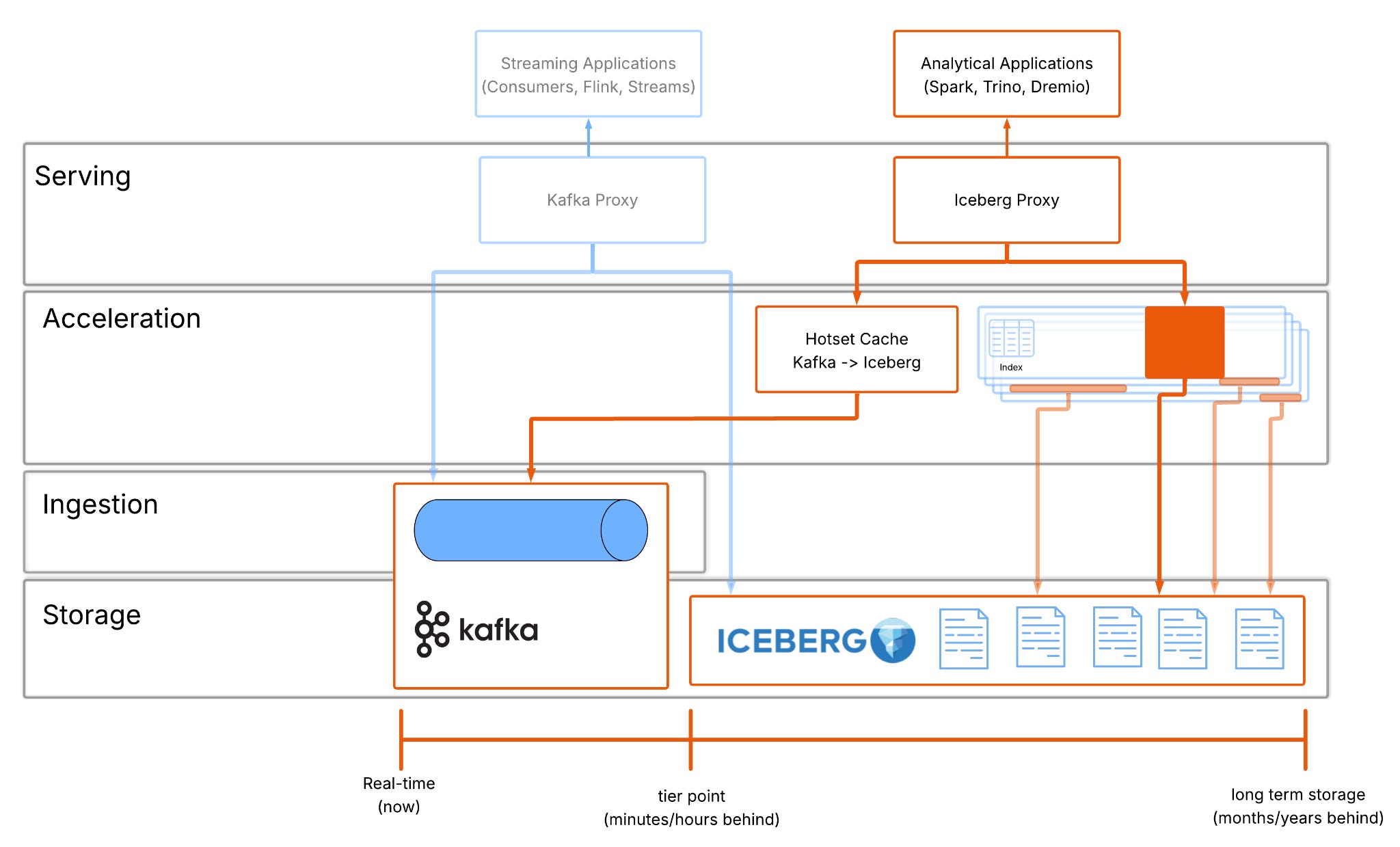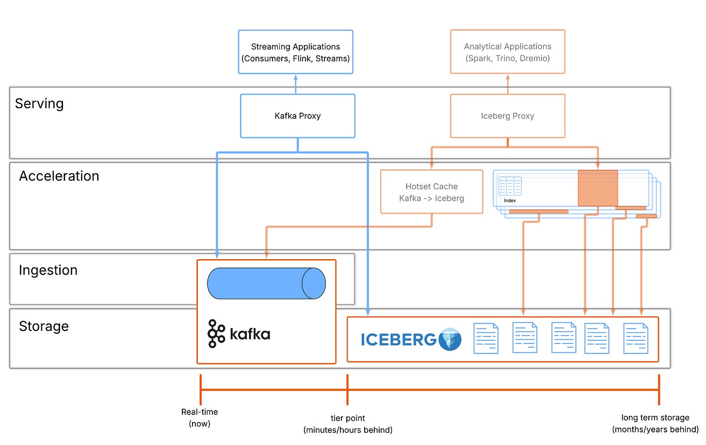 This allows Iceberg clients to see one logical table, clients query a single table but under the hood, the cache is doing the work of DB internals.