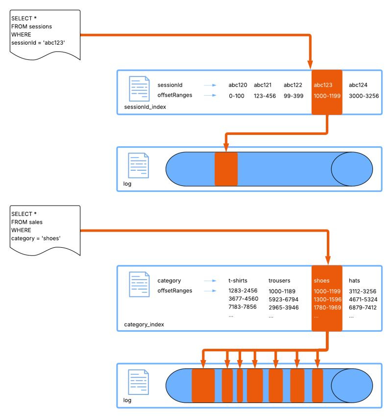 These indexes don’t physically reorder data to answer queries faster. Instead, they layer lightweight additional structures that map question (“what happened at time x”) onto the original data layout.