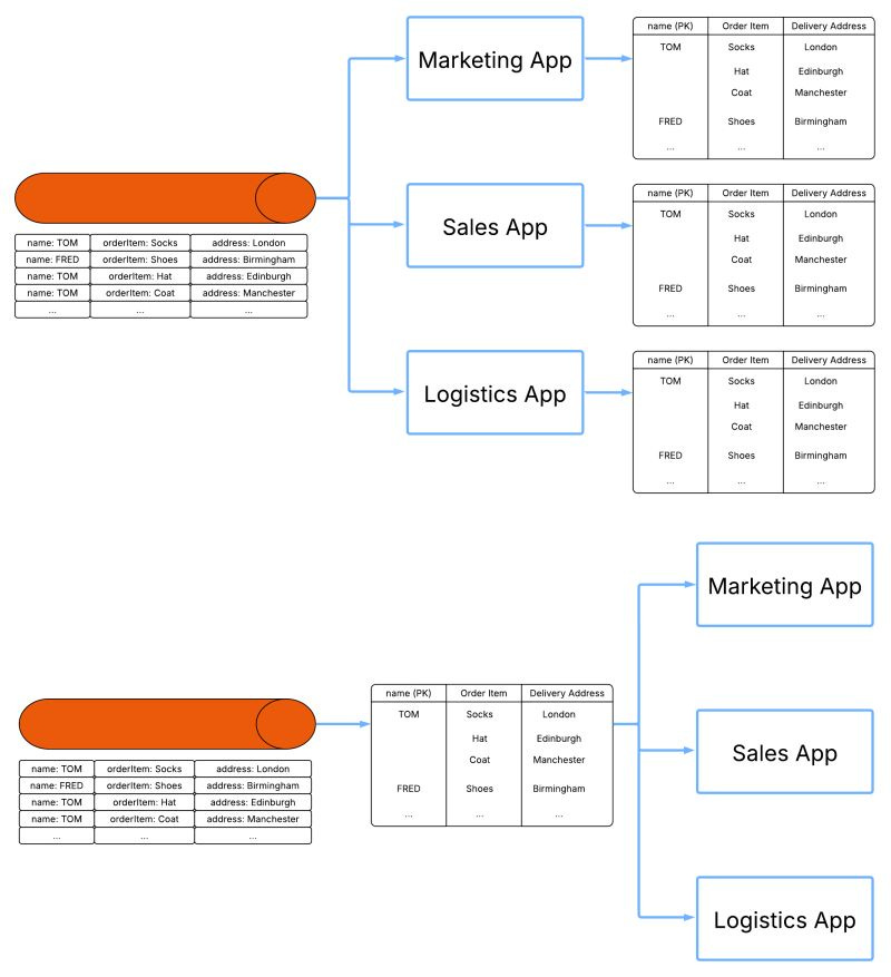 Materialisation of these events in a downstream view (e.g. state in Streams/Flink or DB tables via Kafka Connect).
